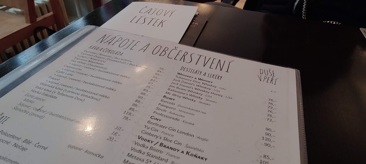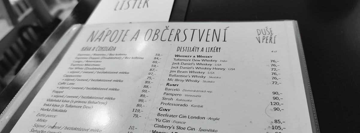 Welcome to Duse v peri, a delightful café nestled in the heart of Nové Město, Czechia. This hidden gem offers a cozy atmosphere that's perfect for a relaxed coffee break or a sweet treat. The menu is a tempting array of choices, featuring scrumptious options such as the traditional Medovník for CZK 75, rich Cheesecake, and seasonal Meruňkový koláč, all priced reasonably at CZK 75. For those who enjoy a refreshing drink, the café serves classic Pilsner Urquel at CZK 67, alongside a selection of red wines like the exquisite 2017 Malbec.